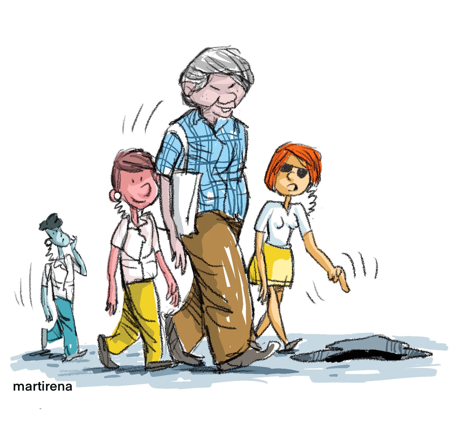 Apenas había dado unos pasos, otro grupo de jovencitos que retozaban por el lugar, en vez de soltar el ¡Ten cuidado! dijeron: por detrás, a su izquierda viene una motorina, y delante, en la carretera hay un hueco sin tapa.