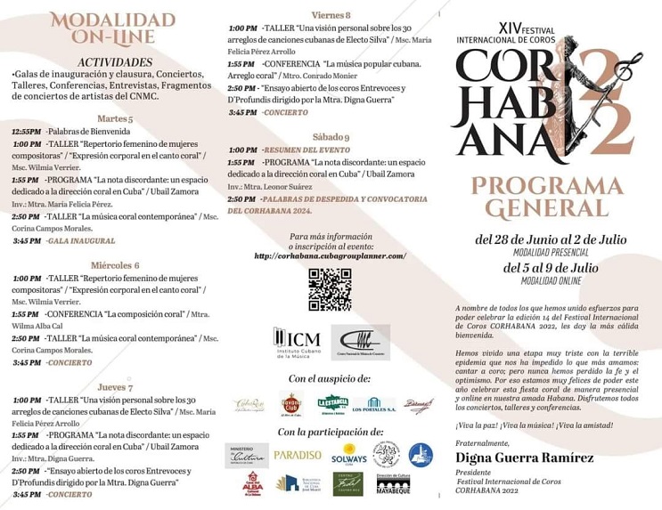 De igual forma, aún no culmina el XV Festival Internacional de Coros CORHABANA 2022. Su modalidad online, sesionará hasta este 9 de julio, donde se debatirán temas como la expresión corporal en el canto coral, la música coral contemporánea, la música popular cubana, la música coral para niños y jóvenes y otros dedicados a cómo hacer una correcta selección de repertorios para un programa de concierto.