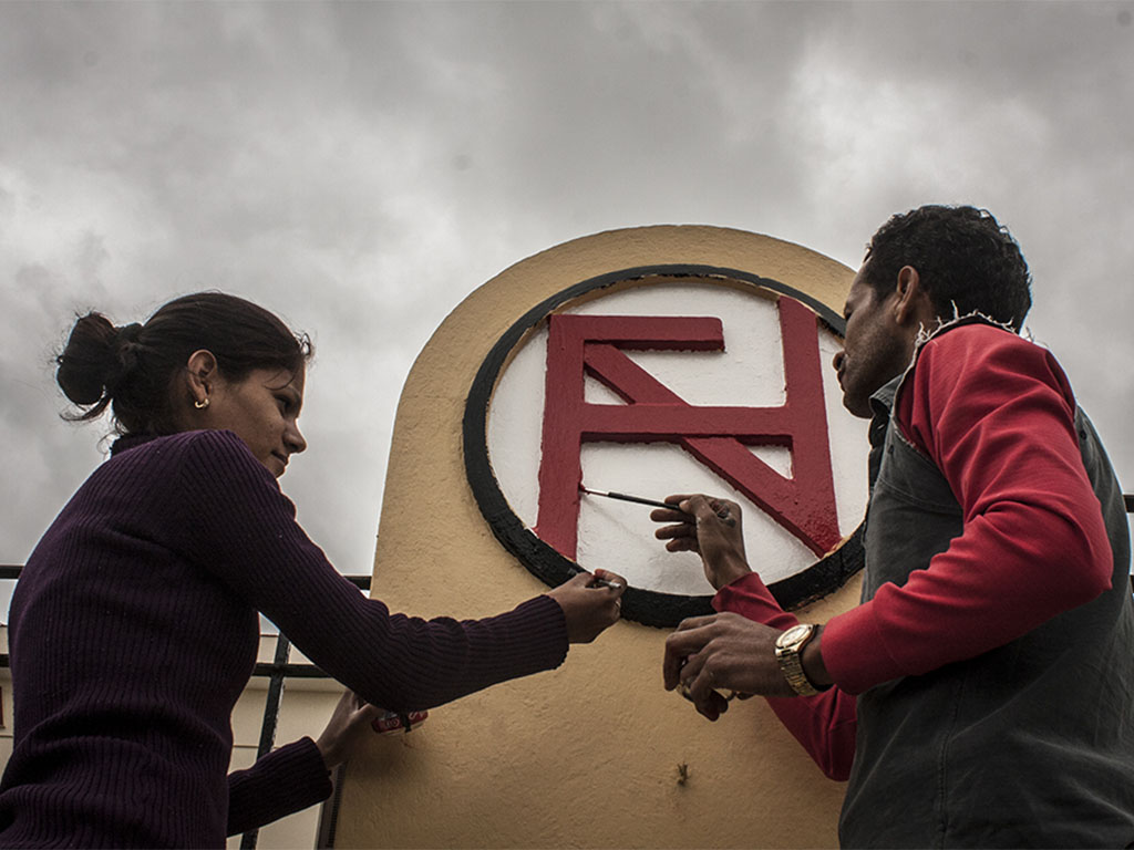 El diseñador y muralista Luis Miguel Jiménez Rodríguez ha sido la mano detrás de los colores que resaltan las chapas de botellas de cervezas, algunas ya desaparecidas, pero que alcanzaron gran renombre. Cuenta que personas mayores, vecinas del lugar, les han dicho que nunca se había hecho tal obra, ni siquiera en su inauguración. Luis habla con satisfacción pues es uno de los trabajos más interesantes y exigentes que ha enfrentado y reconoce la importancia de la historia. También habla con orgullo de su joven hija Sheila Jiménez Alfonso que lo acompaña en la obra. Graduada de Bibliotecología, Sheila labora con Luis, desde bien pequeña, en las encomiendas que él realiza como trabajador de la cooperativa. De niña, dice, le agarraba los pinceles al padre y actualmente también pinta en lienzos. Hoy, subida en los andamios, de trazo en trazo nos habla de la satisfacción que siente al seguir sus pasos.