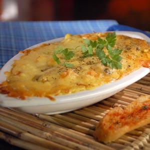 Después, debes cubrirlo con un papel engrasado e introducir en el horno, por un tiempo de 8 minutos, aproximadamente, sacar del recipiente y escurrirlo. Situar sobre recipiente refractario, introducirle la muela de cangrejo, hervida y limpia, de forma que sobresalga artísticamente la parte no carnosa. Cubrir con salsa bechamel, colocar láminas de queso y gratinar en salamandra u horno bien caliente.