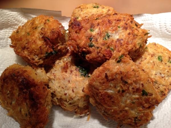 Se pone a calentar aceite abundante en una sartén y se van friendo cucharadas de la mezcla. Se pudiera amasar un poco la mezcla y darles forma de croquetas. También se pueden hacer así y quedan más bonitas de aspecto, pero con el exterior menos crujiente. Se fríen exactamente igual que si fueran croquetas y, al sacarlas de la sartén es mejor dejarlas sobre un colador para que escurran el exceso de aceite.