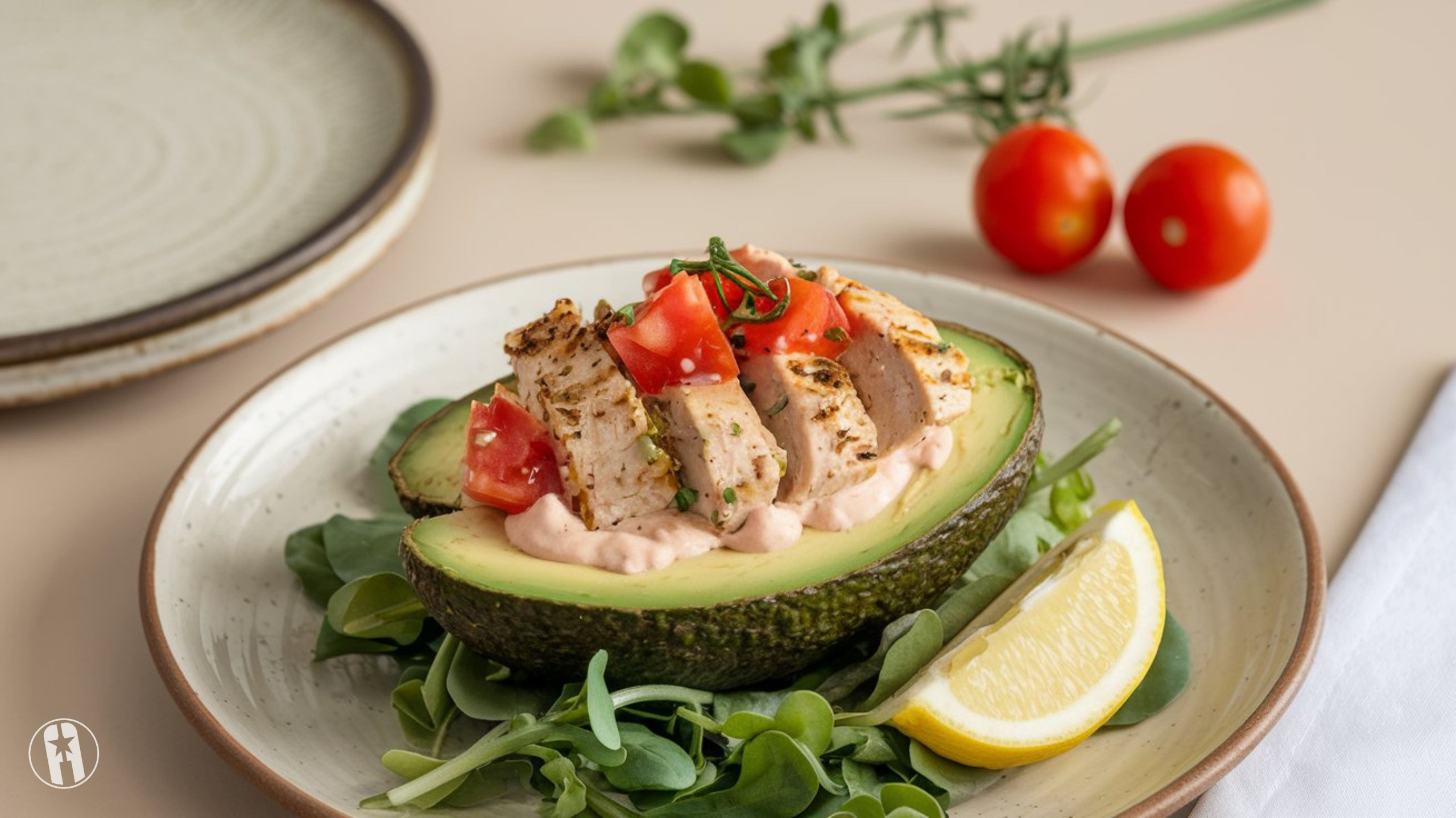 Rellenar cada mitad de aguacate con la combinación de pollo.