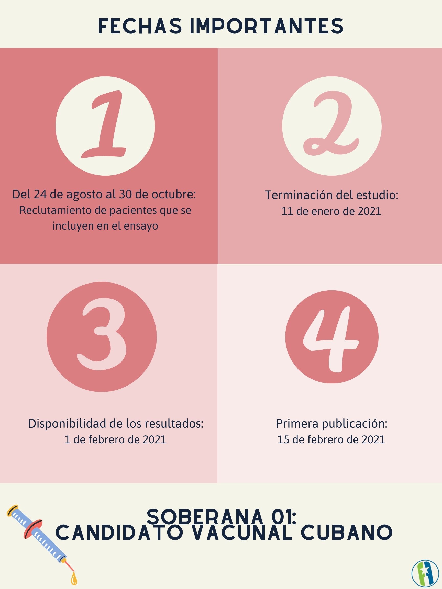 En el caso cubano, la fecha de inicio del reclutamiento de personas para el estudio comienza el próximo 24 de agosto y concluye el 30 de octubre. Luego del proceso de investigación y desarrollo la primera presentación de resultados será el 15 de febrero de 2021.