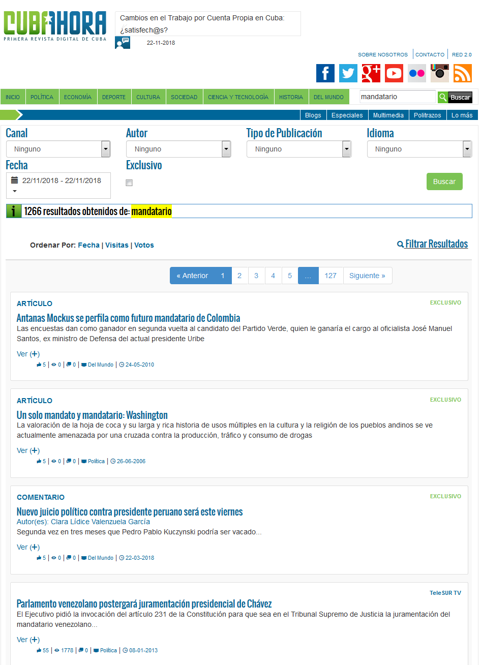 Si ya buscaste una vez en nuestro sitio y no encontraste lo que deseabas, vuelve a hacerlo. Esta vez quedarás más complacido. Busca, por ejemplo, la palabra “mandatario”: encontrarás artículos publicados en la revista en los que aparecen este término y otros similares como “presidente”, "dirigente de alto nivel"... También si por descuido haces consultas con errores ortográficos, el buscador arroja los resultados que deseas.