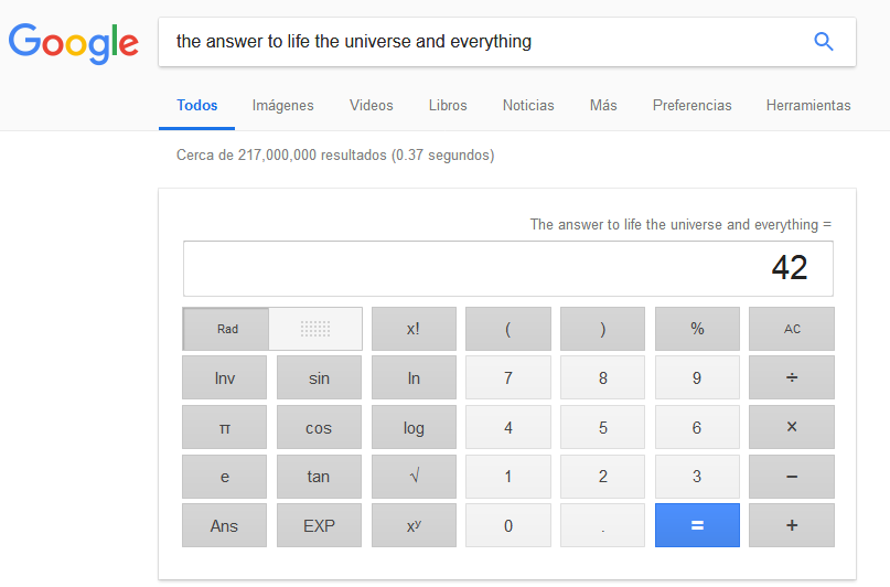 Curiosidad 1: Si se busca en Google en inglés la respuesta a la vida, el universo y todo lo demás, la primera respuesta es 42, un homenaje al libro de Douglas Adams.