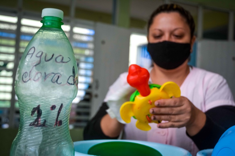 Los círculos infantiles han mantenido su funcionamiento, fundamentalmente para aquellas madres trabajadoras que lo necesiten. El lavado de los juguetes en el Círculo Infantil Amiguitos del Minint, es una de las tantas acciones que se realiza en el centro, como cumplimiento estricto de las medidas higiénico-sanitarias indicadas para preservar la salud de los niños y de los trabajadores de esa institución de Las Tunas (Foto: Yaciel Peña de la Peña/ACN)