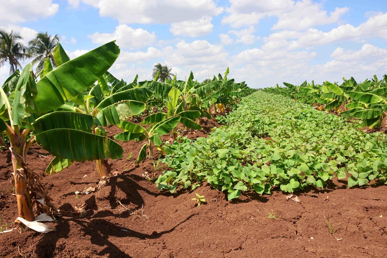 Sembrado de plátano con cultivo intercalado de boniato, en tierras ofrecidas en usufructo pertenecientes a la Unidad Empresarial de Base Frank País García, localizadas en el polo productivo Cautillo-Bejuquero, del municipio Bayamo, provincia de Granma. (Armando Ernesto Contreras Tamayo/ACN)