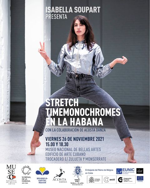 Stretch Timemonochromes, proyecto de la coreógrafa belga Isabella Soupart, diseñador textil Jean-Paul Lespagnard y director musical Guy Vandromme. Foto: Cuenta de Twitter de la Bienal de La Habana