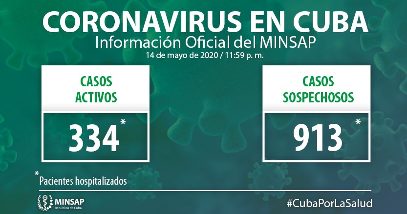 Al cierre del día de ayer, 14 de mayo, se encuentran ingresados en hospitales para vigilancia clínico epidemiológica 913 pacientes. Otras 2 mil 947 personas se vigilan en sus hogares, desde la Atención Primaria de Salud.