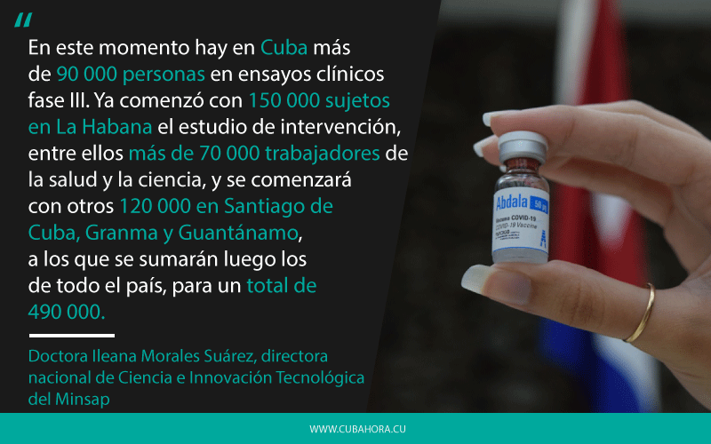 Mientras tanto, Abdala, desarrollada por Centro de Ingeniería Genética y Biotecnología (CIGB), inició el lunes la Fase III de ensayos clínicos que involucra a 48 000 voluntarios de los municipios cabeceras de Granma, Guantánamo y Santiago de Cuba.