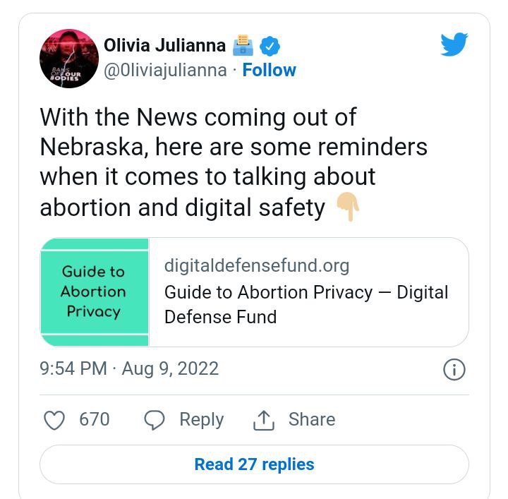 Uno de los tweets principales fue lanzado por la activista juvenil, Olivia Juliana, quien alertaba: “Mucha gente está perdiendo la perspectiva aquí. Independientemente de lo que haya en esos mensajes, pensaron que ella había abortado. Citaron a Facebook, que cooperó sin oposición, para obtener más información. Este precedente es peligroso. Esto pondrá a las personas en riesgo”.