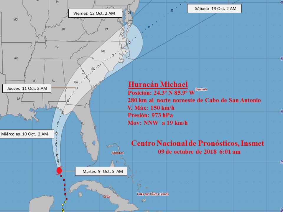 A las seis de la mañana de hoy, el centro del huracán Michael se estimó en los 24.3 grados de latitud Norte y los 85.9 grados de longitud Oeste, posición que lo sitúa a unos 280 kilómetros al nortenoroeste del Cabo de San Antonio, extremo occidental de Pinar del Río.