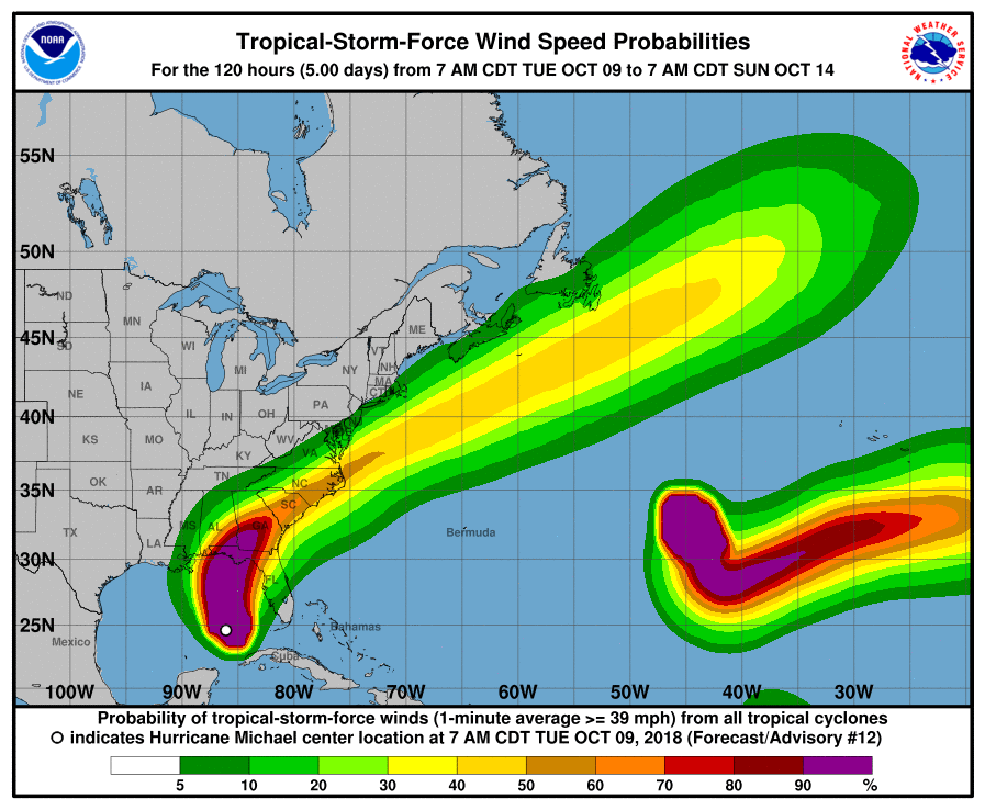 Al mediodía de hoy Michael se desplazaba a 19km/h con rumbo próximo al norte y su ubicación se estimaba en los 25.2 grados de latitud Norte y los 86.2 grados de longitud oeste, posición que lo sitúa a unos 515 kilómetros al sur de Apalachicola, estado de La Florida.