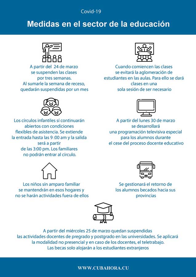 Con respecto al curso escolar, la ministra de Educación, Ena Elsa Velázquez, refirió que quedarán suspendidas las clases durante las próximas tres semanas, más una semana de receso escolar, lo que sería en total un mes en las casas.