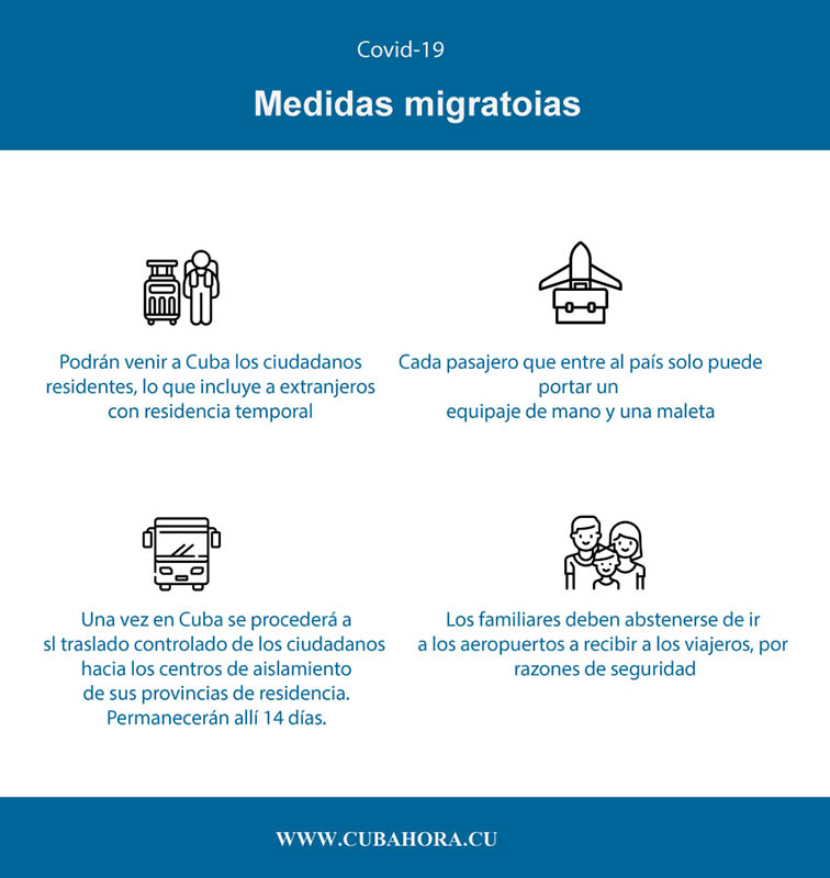Solo podrán viajar Cuba los ciudadanos residentes en el país, lo que incluye a ciudadanos extranjeros con residencia temporal. El ministro expresó que Cuba no cerrará fronteras a sus nacionales, y que todos serán recibidos aún con la enfermedad, sin embargo no estimula los viajes fuera del país en estos momentos, por los riesgos que conllevan.
