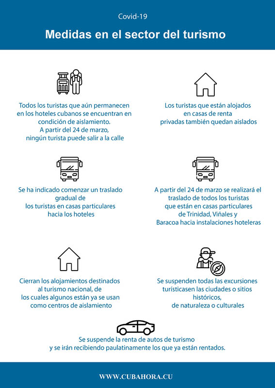 Por precaución se tomó la medida de mantener aislados en los hoteles a los turistas que permanecen en la nación y llevar hasta allí a los que aún permanecen en casas de alquiler, para su mejor seguridad.