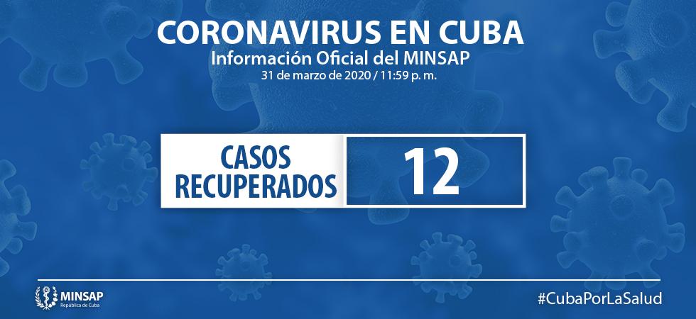 - Ciudadana cubana de 40 años, residente en el municipio Placetas, Villa Clara. El día 27 de marzo comenzó con los síntomas. Se encontraba ingresada en el Hospital “Manuel Fajardo” por ser contacto directo. Se mantiene con evolución satisfactoria hasta el momento. Se encuentran en vigilancia 8 contactos de este paciente.