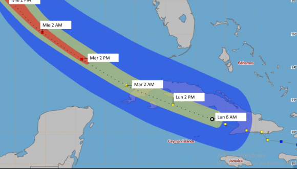 En horas de la noche su centro se encontrará en la costa sur entre Artemisa y Pinar del Río, y el área de influencia ocupará toda la región occidental con lluvias fuertes e intensas y vientos sostenidos entre 65 y 80 km/h con rachas superiores.