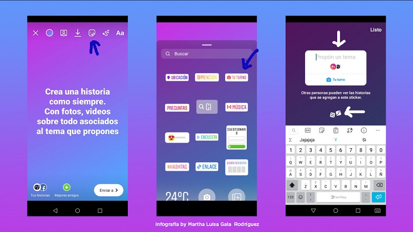 Si quieres interactuar con el sticker de una cuenta que sigues solo tienes que tocarla donde dice “Tu turno, con la camarita” y automáticamente te habilita la creación de una historia, y nada más tendrás que seleccionar la foto o video a usar y embellecerla con tus textos, menciones, hashtags, música y demás. Estos últimos no son necesarios, pero siempre que quieras puedes usarlos.