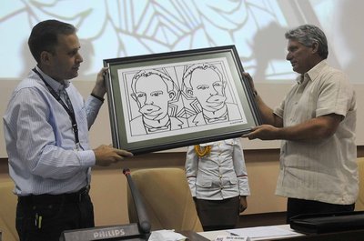 Los delegados al Congreso obsequiaron al Comandante en Jefe Fidel Castro, a través de la figura de Miguel Díaz-Canel, una obra de Raúl Martínez que refleja el profundo espíritu martiano del líder histórico de la Revolución.