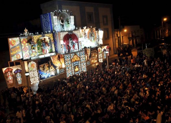 Con la Nochebuena llegan los paseos y la competencia vuelve entre congas y brillos. La torre real queda en la cima de la montaña, como símbolo de aquel espacio donde vivían, crecían y se educaban niños huérfanos, en la primera escuela de oficios que tuvo Cuba. Otra torre, de cartón, sobrevive entre planos, recortes de vestuarios y bombillos, en el pequeño espacio donde Ibrahim y su equipo de trabajo almacenan sueños de espectáculos pasados y futuros.