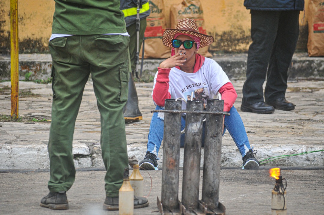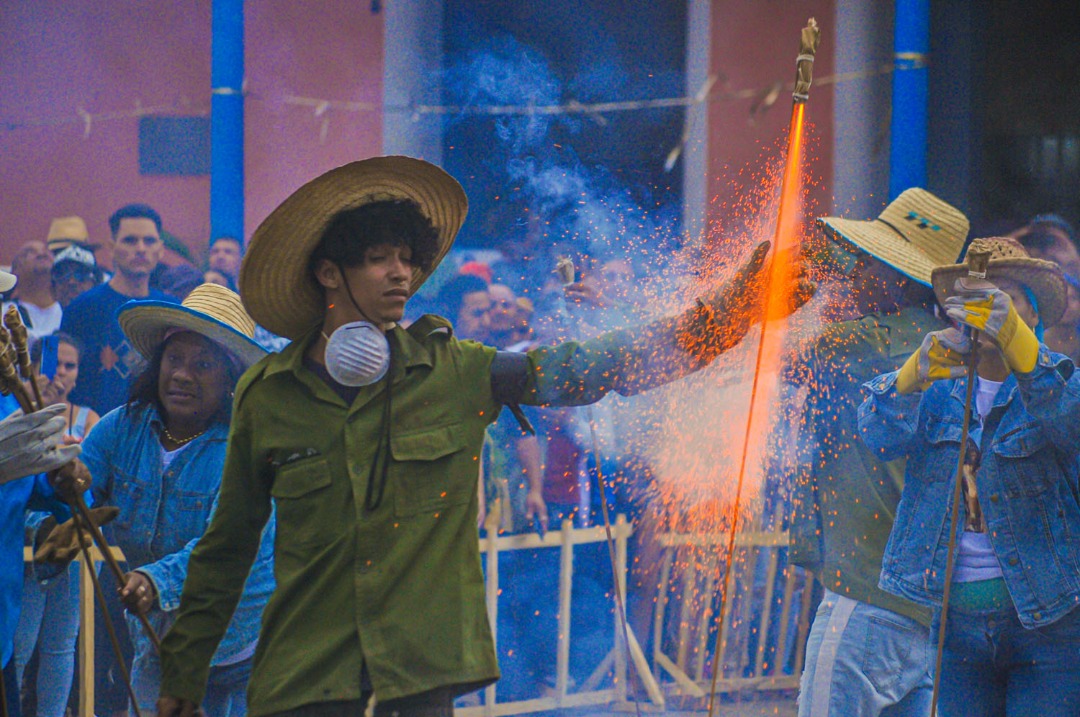 En el norte de la plaza, San Salvador; en el sur, El Carmen. Estos viejos rivales dieron lo mejor de sí. Los carmelitas comenzaron con una entrada de palenques y de morteros explosivos que retumbaron sobre los tejados y las paredes. Sus rivales, los sansarices, homenajearon a los parranderos fallecidos con la Covid 19, quienes dieron por décadas su esfuerzo para que el barrio del gallo triunfara. El fuego estalló en el cielo sin cesar, en miles de colores. El campanario de la iglesia se tiñó de rojo varias veces, las llamas alcanzaron una dimensión fantasmal, mitológica. Remedios, a la altura de las cinco de la tarde del día de las Parrandas era un campo de batalla, en el cual sonaban además los cencerros, los tambores, las rejas, las trompetas. Se coreaban cánticos que tienen doscientos años o más, se bailaban polkas que fueran también bailadas por nuestros tatarabuelos. La máquina del tiempo se hizo presente, nadie quería irse de la plaza, éramos un hervidero de pasiones.