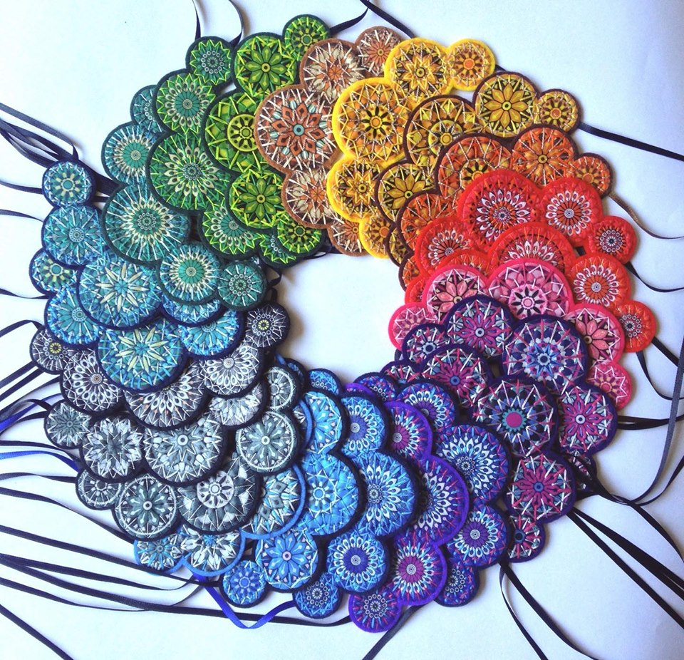 Collares ilustrados, transferidos a tela y bordados por la diseñadora Katy Ocaña. (Foto: Perfil de Facebook de la autora)