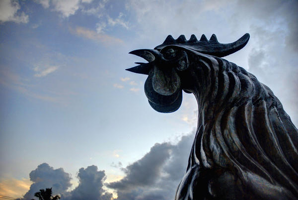 Allí está aún, acompañado por una torre-reloj y de los equipos de amplificación que reproducen el canto del ave. Una tarja develada al pie del gallo dice que este “expresa el espíritu de lucha de nuestro pueblo en la defensa de su soberanía”.