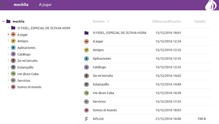 El lanzamiento de la Mochila #1 será el 6 de enero del próximo año. Cuatrocientos diecisiete (417) Gb agrupan un total de 13 carpetas que contienen 11 233 archivos, con amplia variedad de materiales audiovisuales, tanto nacionales como internacionales: videojuegos, cine, novelas, música, humor, deportes, literatura, aplicaciones informáticas, servicios, cursos y materiales infantiles.