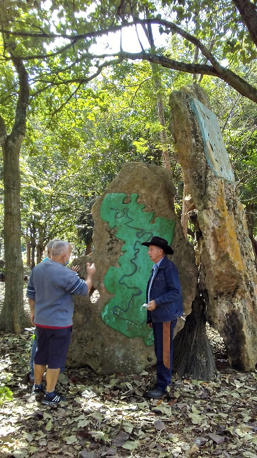 Sitio especial ocupa la réplica de la campana de La Demajagua —regalo del historiador Eusebio Leal—, la cual repica al viento porque, como dice Felo, “¡en Cuba, la campana de Céspedes no debe dejar de sonar nunca!”. Más allá hay un monumento a Cinco Palmas, otro a la mujer y un dibujo rupestre que resume los meandros del río Ariguanabo. Sobre un promontorio, se simula la cueva de Juan Ramírez, que es donde, me confiesa Felo, suele pasar los aguaceros. Allí una cita martiana nos recuerda que “subir lomas hermana hombres”.