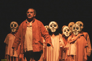 Recién finalizaba la representación en la habanera sala Hubert de Blanck. Ya el público se había retirado y las luces amenazaban con apagarse cuando me acerqué con respeto al maestro Abelardo Estorino para conversar a propósito de su más reciente estreno: Ecos y murmullos en Comala, una versión de la novela Pedro Páramo de Juan Rulfo.