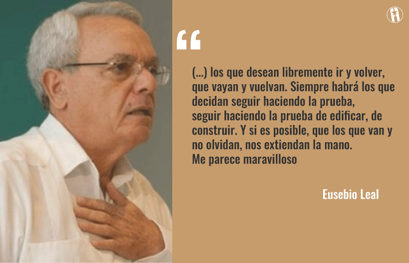 La Emigracion Tiene muchos caminos,quienes transitan en ellos es como dijiera nuestro Querido Eusebio Leal, un Hombre extremadamente sencible, Humilde, honesto y sincero, un perfecto maestro para toda una sociedad como es , un perfecto ser humano en orientarnos sobre la historia y nuestra cultura cubana,el marcho, en lo personal , partio con mi Mayor admiracion y Respeto, escuchar su Voz calidad y con esa elocuencia tan facil y generosa, era como haber escuchado el sonido de la lluvias,en el mes de mayo,me encantaba escucharlo como hoy lo hago,su timbre de voz muy pecualir y personal dejaba a cualquier ser humano a su alrededor permitirle soñar y sentirse en el pasado. y Sobre estas Palabras de la EMIGRACION es como las mismas Aves y las golondrinas, es como una misma gaviota que podria volar quizas en una orrilla de un Puerto y de ser capaz sin ella darse cuenta de viajar al mismo mar pero en otras Tierras, siendo siempre la misma GAVIOTA," Solo aquellos Cobardes, Traidores a sus Condiciones Humanas y a ellos mismos ,seran siempre los arrepentidos de cada accion de ellos en lo Personal y serian siempre los mismos Enemigos de su patria y pueblo como enemigos eternos de la sociedad y pais que los acoja,porque hay muchas maneras de delinquir,de cometer injusticias y de abusar de su misma Condicion como emigrante, ese ,aunque mucho nunca seria capaz de comprar con ese poder economico,politico y social la felicidad , ni la condicion humana que fue capaz de Perderla cuando se decidia a ya traicionar a su mismos Valores y a la condicion Humana en que se convirtio en un Emigrante, en un Gitano, en un Traidor a la Raza Humana, Hasta a la misma Naturaleza. Eusebio Leal tu estas como Muchos seres Humanos y Cubanos en Cuba siempre, en esas calles , en ese cielo, en ese pueblo, en la Historia misma de CubA " alli donde quieras que estes Hoy disertando con tu bella elocuencia, ! GraciasEusebio Leal Tu eres Cuba , eres la habana Tambien , eres sus calles y adoquines.! Gracias !