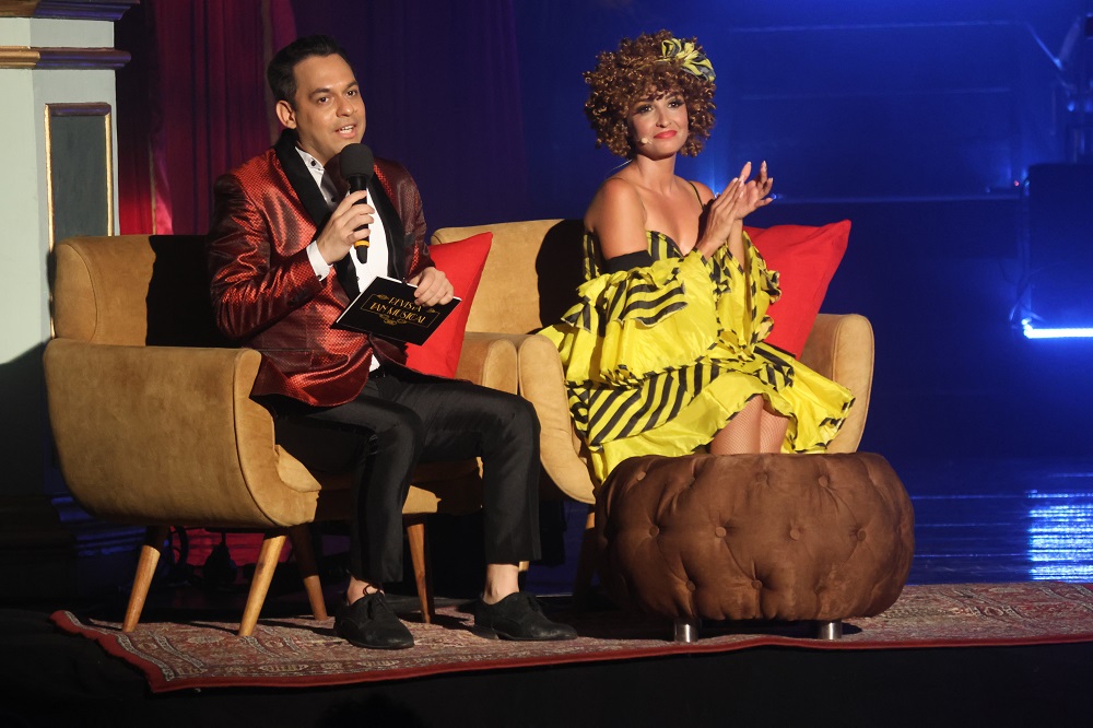 Pedro Pablo Cruz, locutor y manager de la Faílde, cantó en el espectáculo y alternó con su rol de entrevistador en un set, sutilmente colocado en una esquina del escenario, cual transmisión en vivo que se realiza desde este para quienes permanecen en sus casas. Dosis de humor, matizado con cierta sátira, trajeron a la luz comportamientos propios del mundo de la farándula que, de manera elegante y sobria, proponen reflexionar.