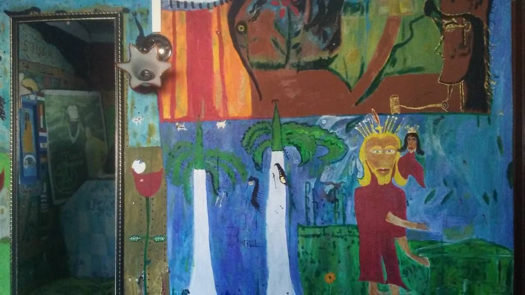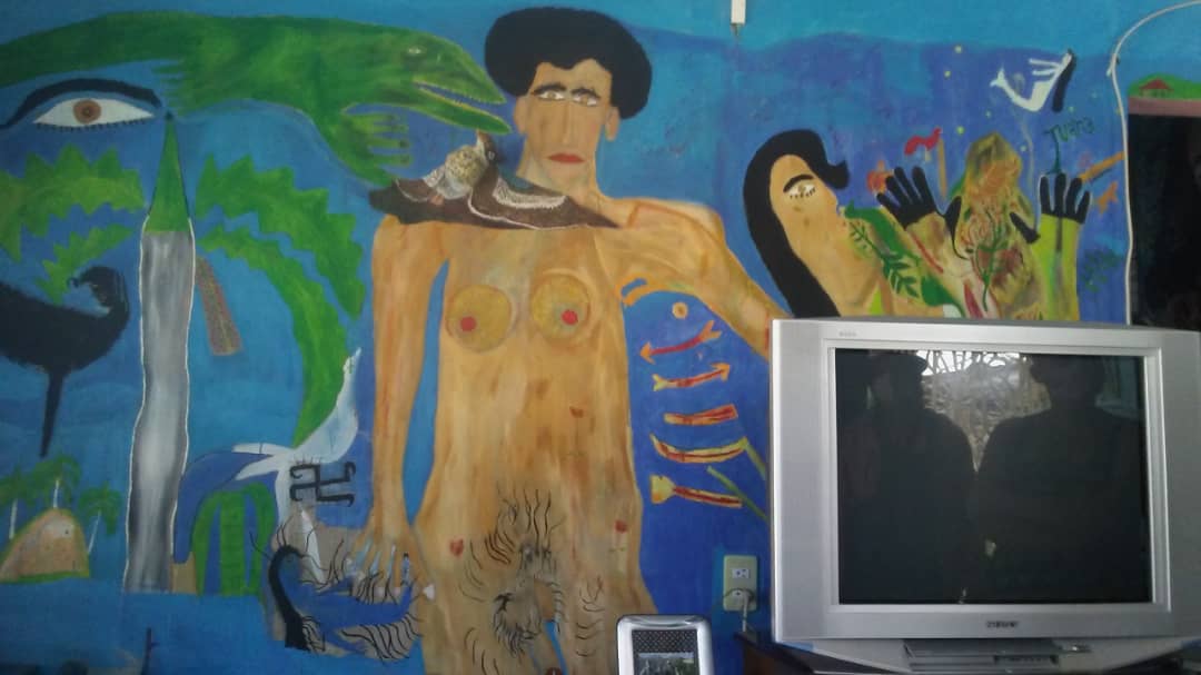 La pieza es un fresco en una de las paredes, junto al televisor, que reproduce dos figuras desnudas en el paraíso. Hombre y mujer caminan entre las aves y la vegetación, rodeados de un azul inmenso que refresca la vista. El rostro inconfundible de Noel nos rodea y nos asalta a lo largo de toda la casa, reproducido en miles de autorretratos en las paredes del pasillo, el comedor, el baño, los dormitorios.