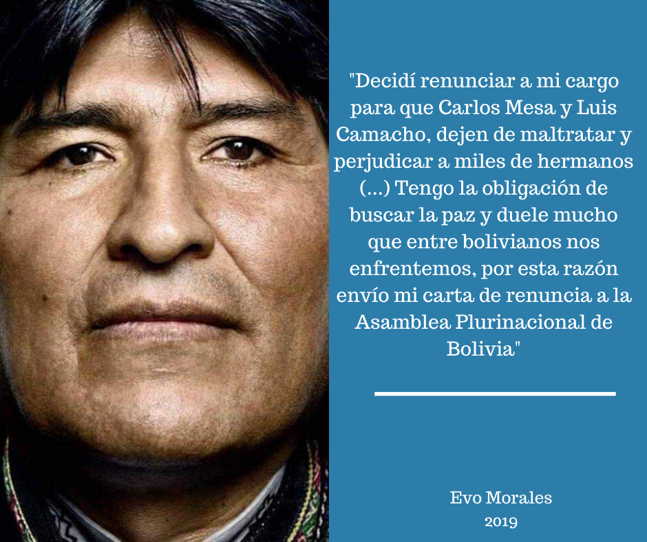 ¨Para que Mesa (Carlos) y Camacho (Luis Fernando) no sigan persiguiendo a mis hermanos, quemando las casas de gobernadores, asambleítas, concejales; no sigan maltratando y secuestrando a los familiares de nuestros militantes, a la gente mas humilde. Estoy renunciando para que mis hermanos no sean perseguidos. Lamento mucho este golpe cívico y de algunos grupos de la policía que se han unido¨.
