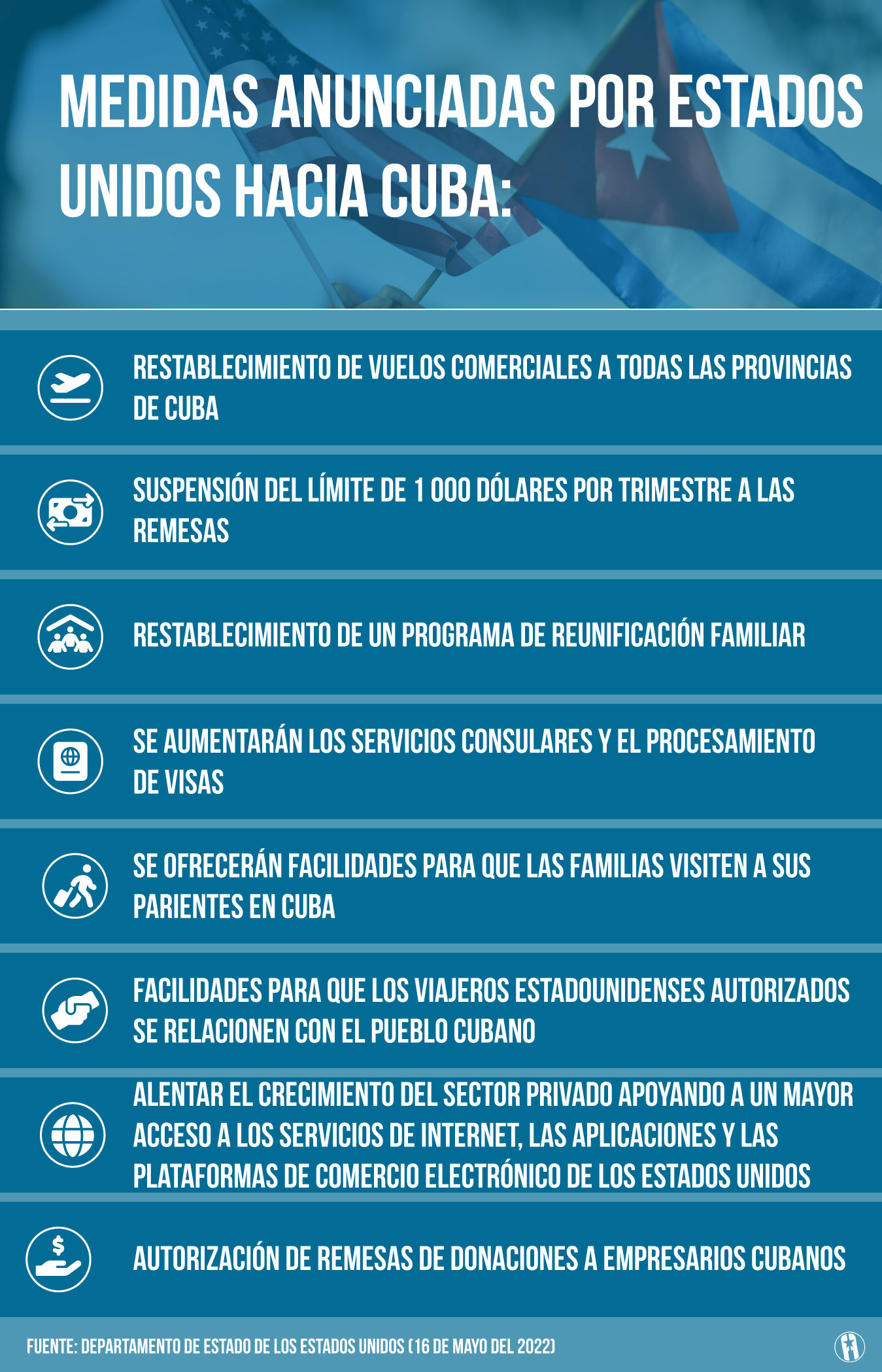 El Departamento de Estado de los Estados Unidos (EE. UU) anunció una serie de medidas para flexibilizar su política hacia Cuba. Según consta en el comunicado emitido, la administración de Joseph R. Biden se plantea, entre otras cosas, facilitar la reunificación familiar, reanudar los vuelos comerciales a las provincias, ampliar el proceso de visas, suspender el límite de US $1.000 trimestrales de remesas por remitente y permitir estos envíos entre personas sin vínculos familiares.