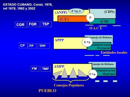 He marcado con el color amarillo los órganos de elección popular directa conforme a lo que tenemos hoy: las Asambleas del Poder Popular, y en color naranja el Consejo de Estado, que tiene un carácter especialísimo, porque se vincula al Jefe de Estado, pero nace de la Asamblea, sus integrantes son diputados, y representa al Estado; entonces tiene una doble función.