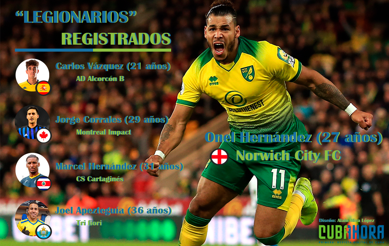Los cinco “legionarios” son: Onel Hernández (Norwich City FC, EFL Championship), Jorge Corrales (Montreal Impact, MLS), Carlos “Cavafe” Vázquez (AD Alcorcón B, 3ra División de España), Joel Apezteguía (Tri Fiori, Campionato Sammarinese di Calcio) y Marcel Hernández (CS Cartaginés, Liga Promerica).