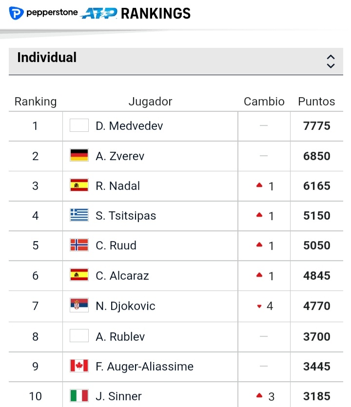 Mientras esto sucede, el número uno lo mantiene Daniil Medvedev, un tenista que esta temporada no ha ganado absolutamente nada, aunque logró avanzar a la final de Abierto de Australia, donde cedió fácilmente ante Nadal. A pesar de no competir por el veto a rusos y bielorrusos, el moscovita mantiene el puesto de honor (7775 puntos), con casi mil unidades más que el alemán Alexander Zverev (6850), quien, a pesar de ausentarse en Inglaterra por lesión, se estrena como escolta del líder.