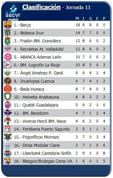 Tabla 1: Clasificación general Liga Asobal (Jornada 11)