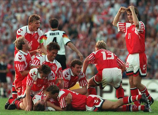 Ocurrió que entre los ocho planteles clasificados para la fase final estaba Yugoslavia, pero la Guerra de los Balcanes determinó la exclusión de ese conjunto. Así, la UEFA concedió la plaza vacante a Dinamarca y -¡oh, milagro!- el último invitado devino campeón a la postre.