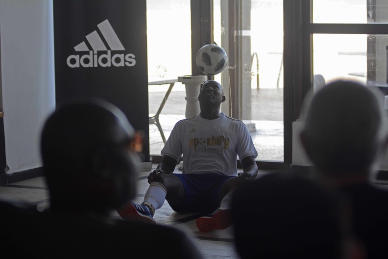 Cuello bien estirado, la vista fija sobre el balón en la vertical, y el toque continuo, en la posición de sentado y solamente con la cabeza, al compás de varios ritmos musicales en el lobby del hotel Copacabana, de la capital cubana.