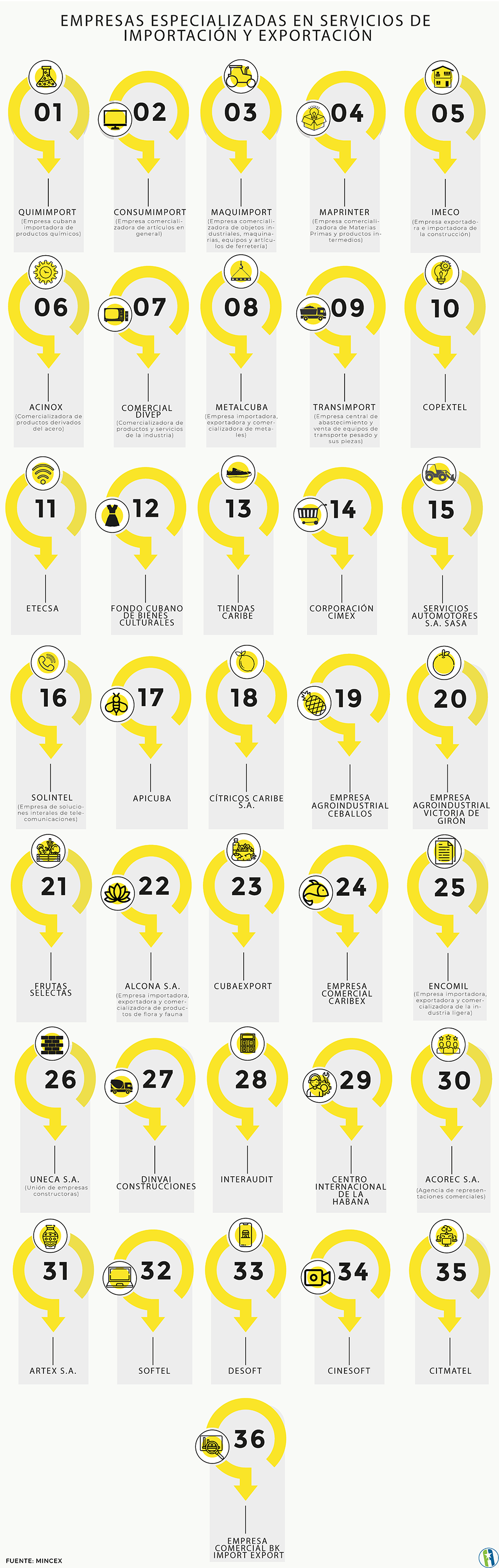 Hasta la fecha, existen 36 empresas cubanas especializadas en servicios de importación y exportación a los trabajadores por cuenta propia, que se ubican en La Habana y otras provincias del país. Para explicar los detalles de cada una de ellas se espera próximamente la resolución 315/20 de la Gaceta Oficial.