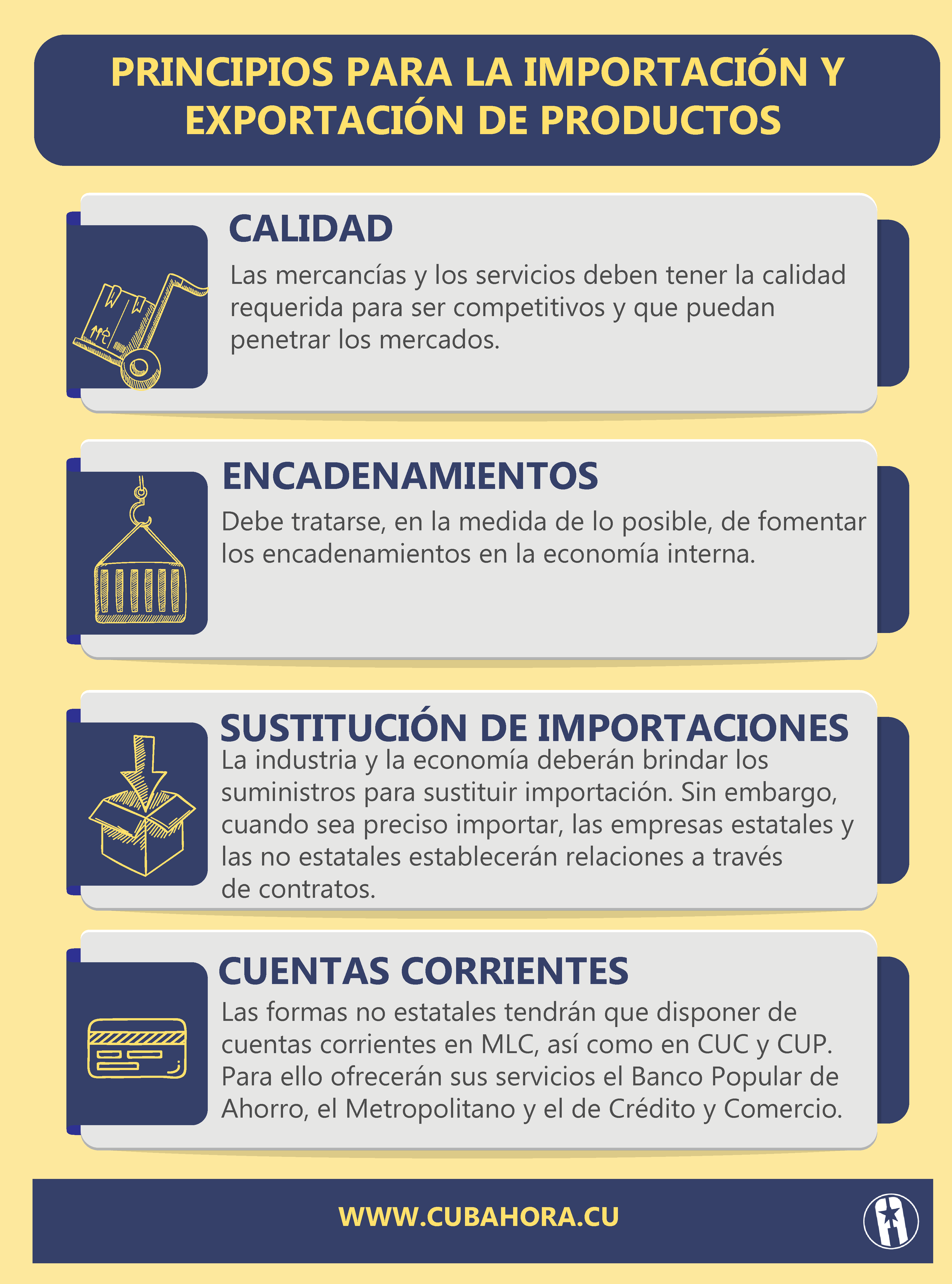 La importación y exportación de productos en Cuba no ha dejado de ser una prioridad para la economía del país. Así lo demuestra, por ejemplo, los Lineamientos de Política Económica y Social del año 2016 donde se explica la necesidad de establecer los mecanismos para canalizar las demandas de importación que surjan de las formas de propiedad y gestión no estatales, así como viabilizar la realización de potenciales fondos exportables.