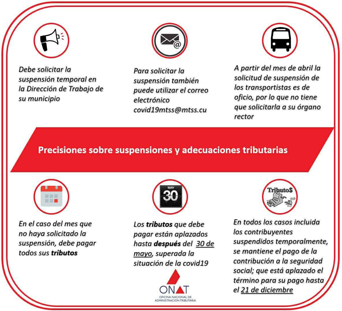 “Hemos estado trabajando en conciliación, de forma tal que los contribuyentes no han tenido que ir a la Onat a hacer los trámites. Como es conocido, más de 225 mil contribuyentes que tienen suspendidas las actividades no pagan impuestos durante esta etapa y hasta la fecha se han otorgado adecuaciones de las cuotas a más de 25 mil”, sentenció Bolaños.
