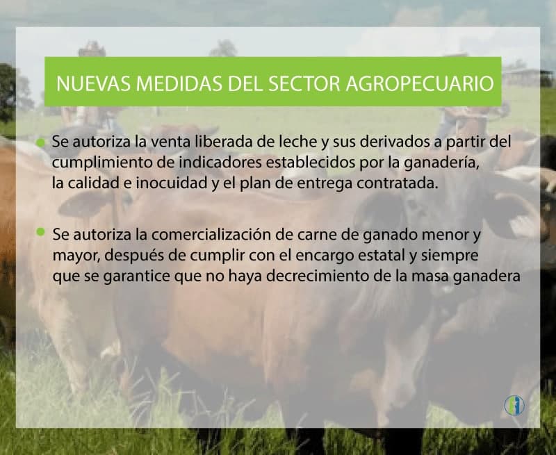 En el caso de la leche y sus derivados, se decidió autorizar su venta liberada a partir del cumplimiento de indicadores establecidos por la ganadería, la calidad e inocuidad y el plan de entrega contratado. Mientras tanto, también se permite la venta liberada de ganado mayor y menor después de cumplir con el encargo estatal y siempre que se garantice que no haya decrecimiento de la masa ganadera en el país.