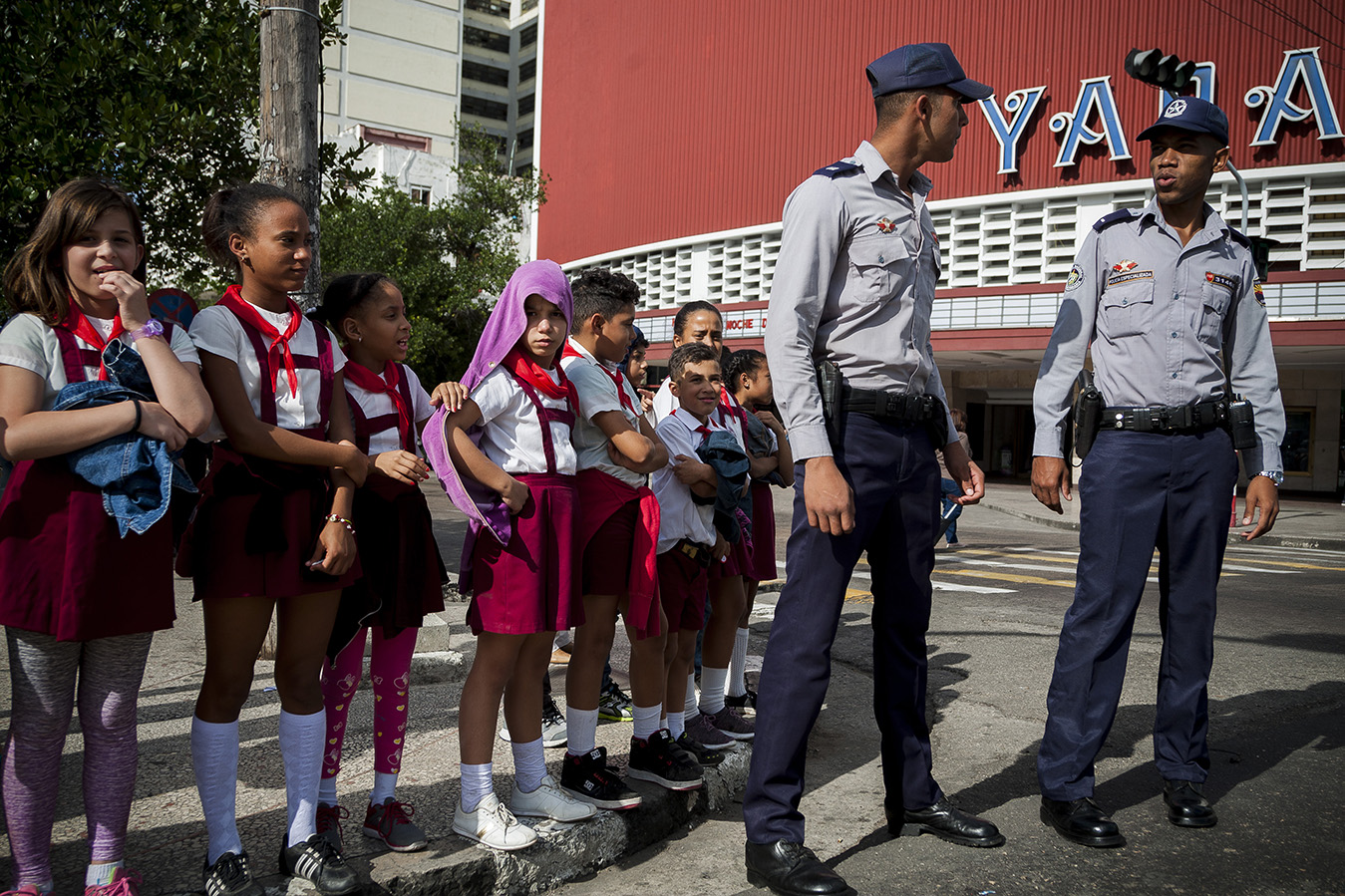 A su paso por la calle 23, frente al edificio del Instituto Cubano de Radio y Televisión, un grupo de guerrilleros se fotografió junto a un niño, hubo selfies, saludos, banderas...