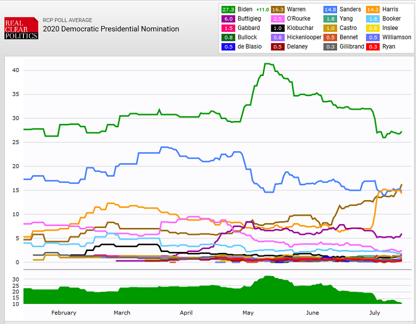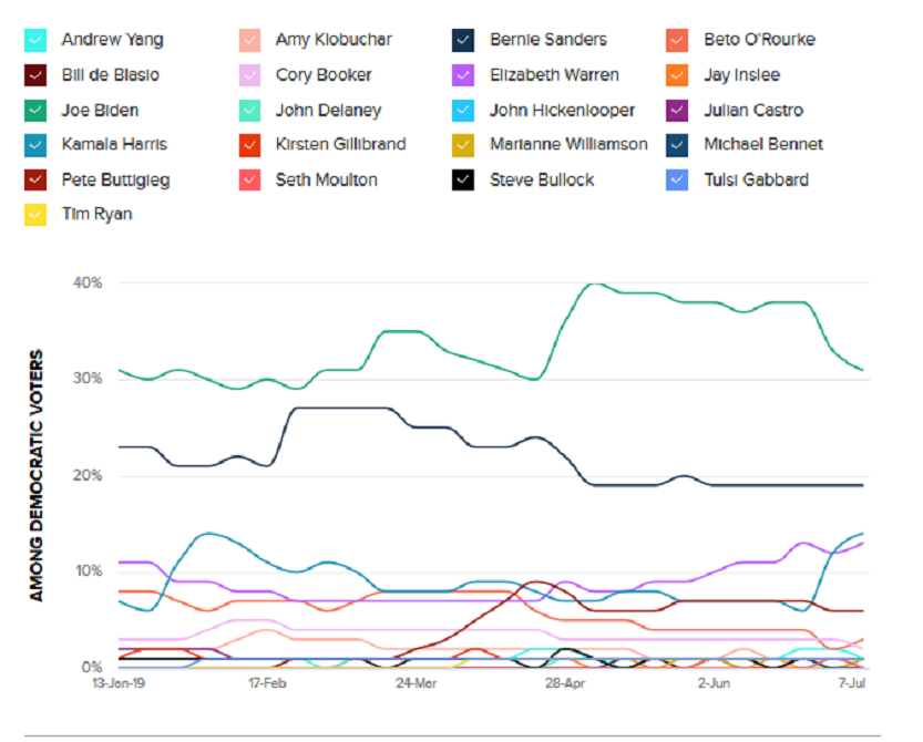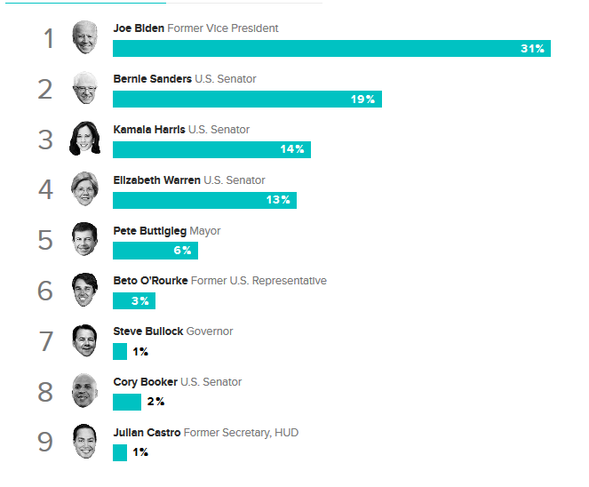 Detrás marchan los senadores Bernie Sanders, Elizabeth Warren y Kamala Harris. El orden de preferencia de los votantes varía según la encuesta que revisemos, pero Warren y Harris han tenido un ascenso en sus números durante las últimas semanas.