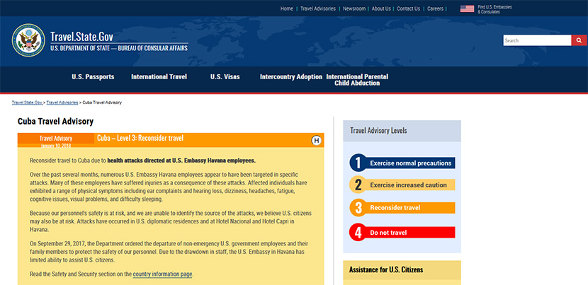 El Departamento de Estado emitió una alerta de viaje en la que recomienda a los ciudadanos norteamericanos reconsiderar un viaje a Cuba. Antes, la nación caribeña estaba en la lista de los destinos a los que se recomendaba no viajar.