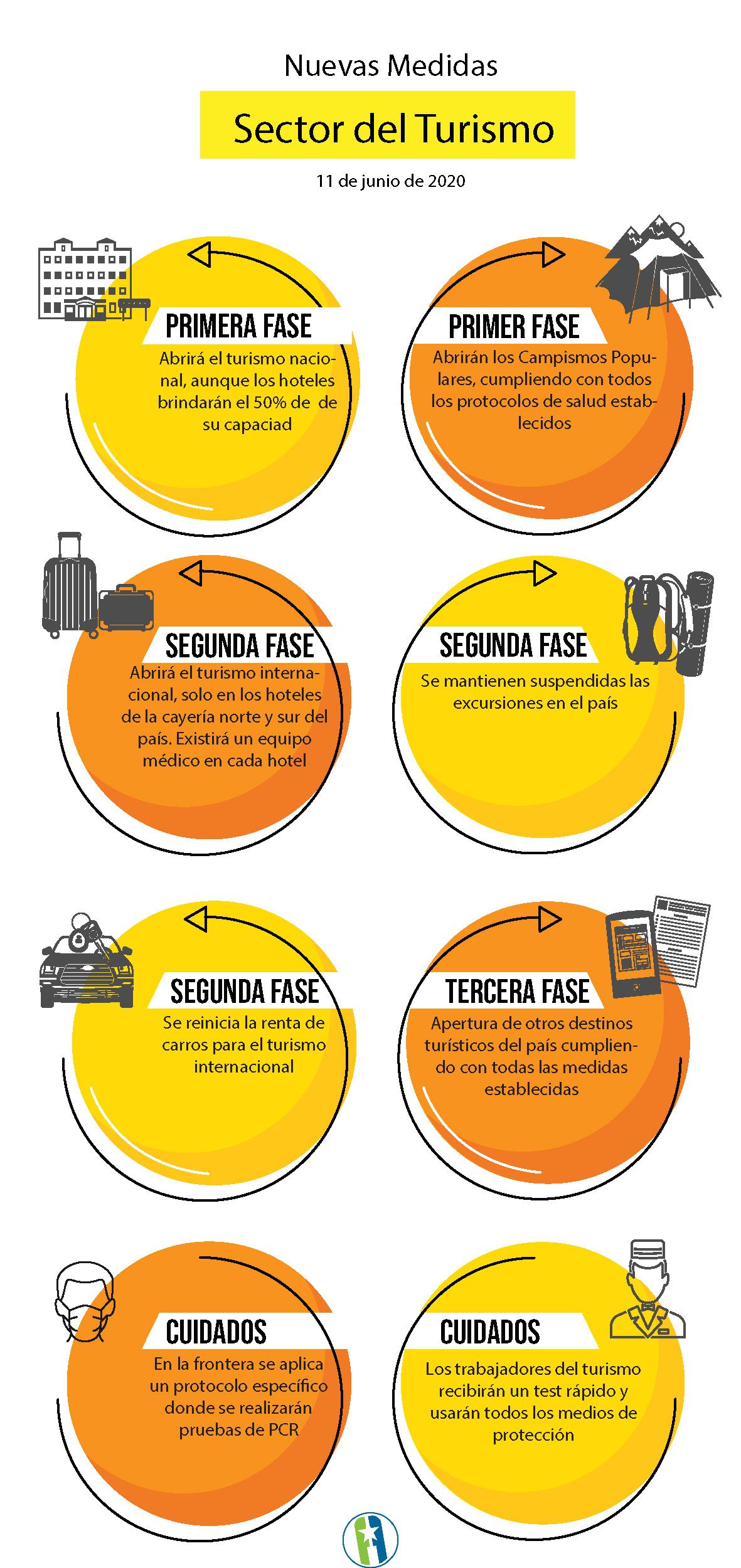 - Los trabajadores del turismo al incorporarse a los hoteles que recibirán turismo internacional, se les hará un test rápido. Dichos trabajadores estarán trabajando por siete días también siendo vigilados clínicamente. Luego de esta semana descansará siete días de descanso en sus viviendas, en forma de aislamiento.